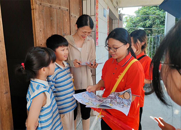 圖為實(shí)踐隊(duì)員入戶宣傳講解愛河護(hù)河理念