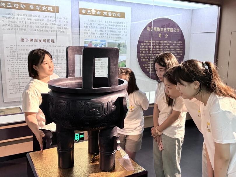 講解員首先介紹了德州梁子黑陶的歷史淵源,據史料記載,黑陶文化起源于黃河流域新石器晚期,是中國古代農耕文化的巔峰之作。沿著展廳前進,講解員對各式黑陶展品進行講解,從古樸典雅的盤、瓶、罐、鼎,到現代氣息濃厚的創新作品,每一件陶器都承載著厚重的歷史與文化信息,無一不展現出了黑陶文化的魅力和無限生機。