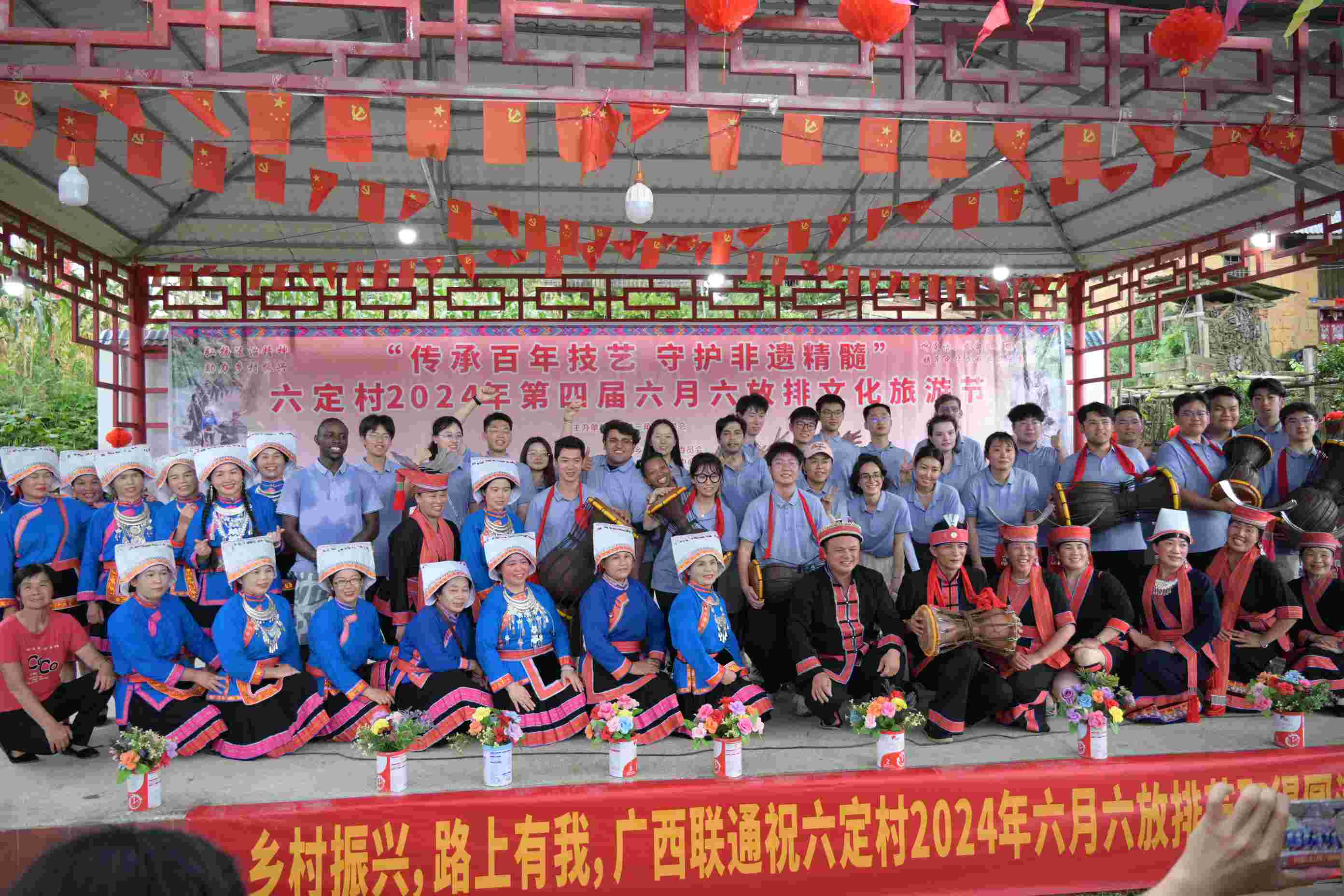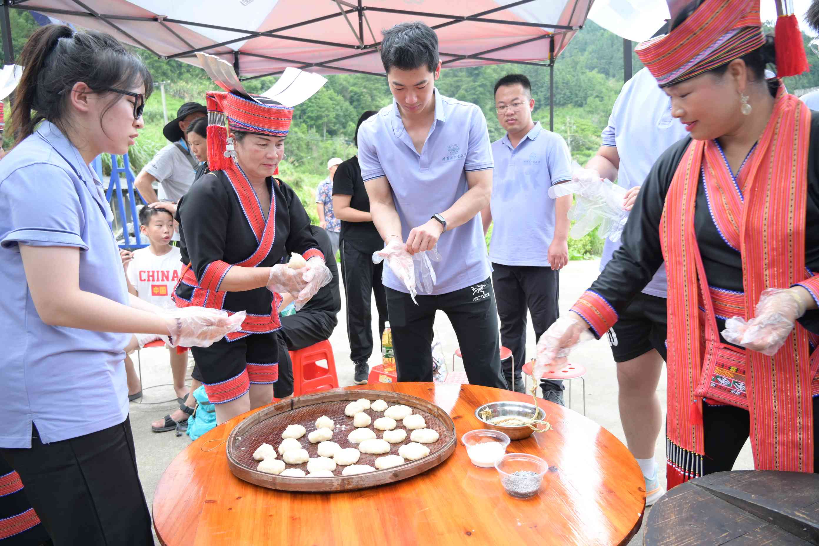 民族團(tuán)結(jié)實(shí)踐團(tuán)還來到六定村歡度“六月六”放排節(jié),領(lǐng)略金秀的人文之美。師生們應(yīng)熱情的瑤族同胞之邀,品嘗瑤族的美食和特色茶飲,體驗(yàn)舂糍粑、黃泥鼓舞,登上舞臺與瑤族同胞攜手翩躚、引吭高歌,共同感受國家級非物質(zhì)文化遺產(chǎn)的魅力。