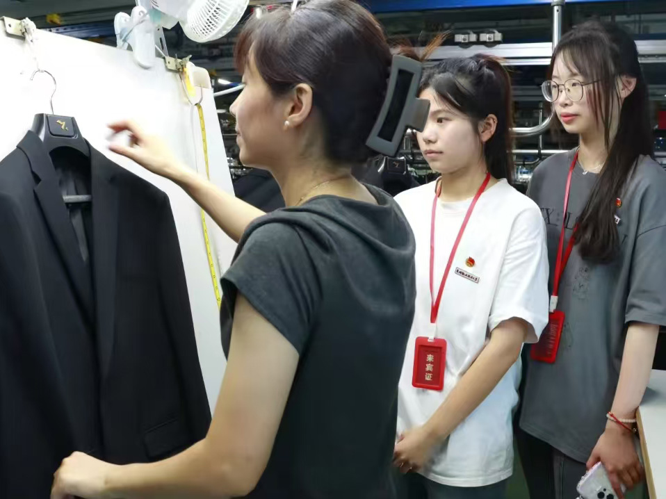 柒牌工作人員為實踐團展示檢查西裝。