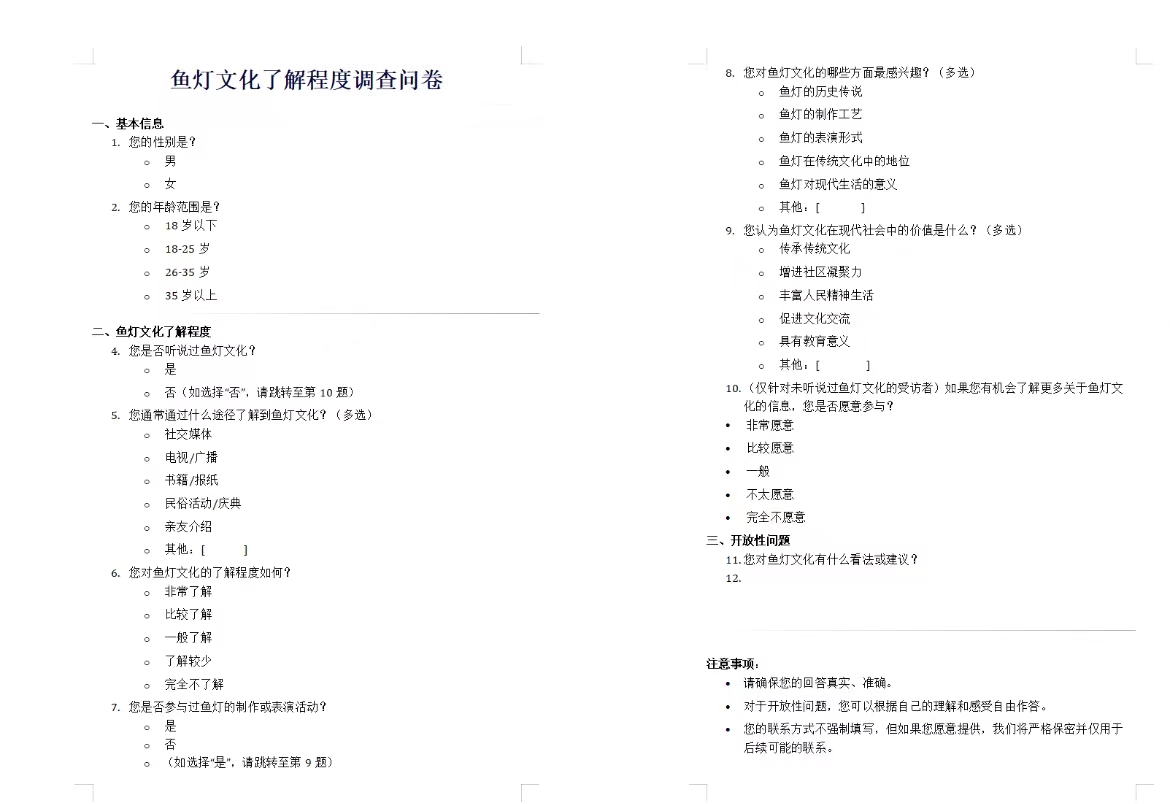 在前期準備工作完成后,我們發放調查問卷來調查年輕人對于魚燈文化的了解程度,為后續引導大學生更加欣賞和了解魚燈文化奠定堅實的基礎。調查問卷的主要發放對象為在校大學生,發放形式為紙質調查問卷填寫。在活動準備階段的一周內,我們一共發放了60份,收回了52份。據后續數據統計結果顯示,很多人對特定地區的魚燈文化(如汪滿田魚燈)有所了解,但仍有相當一部分人表示從未聽說過。對于魚燈文化的保護、傳承和弘揚,受訪者的態度也是問卷關注的重點。大多數人表示支持或非常支持對魚燈文化的保護和傳承。