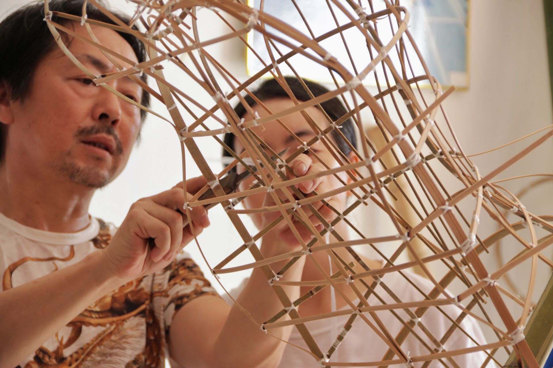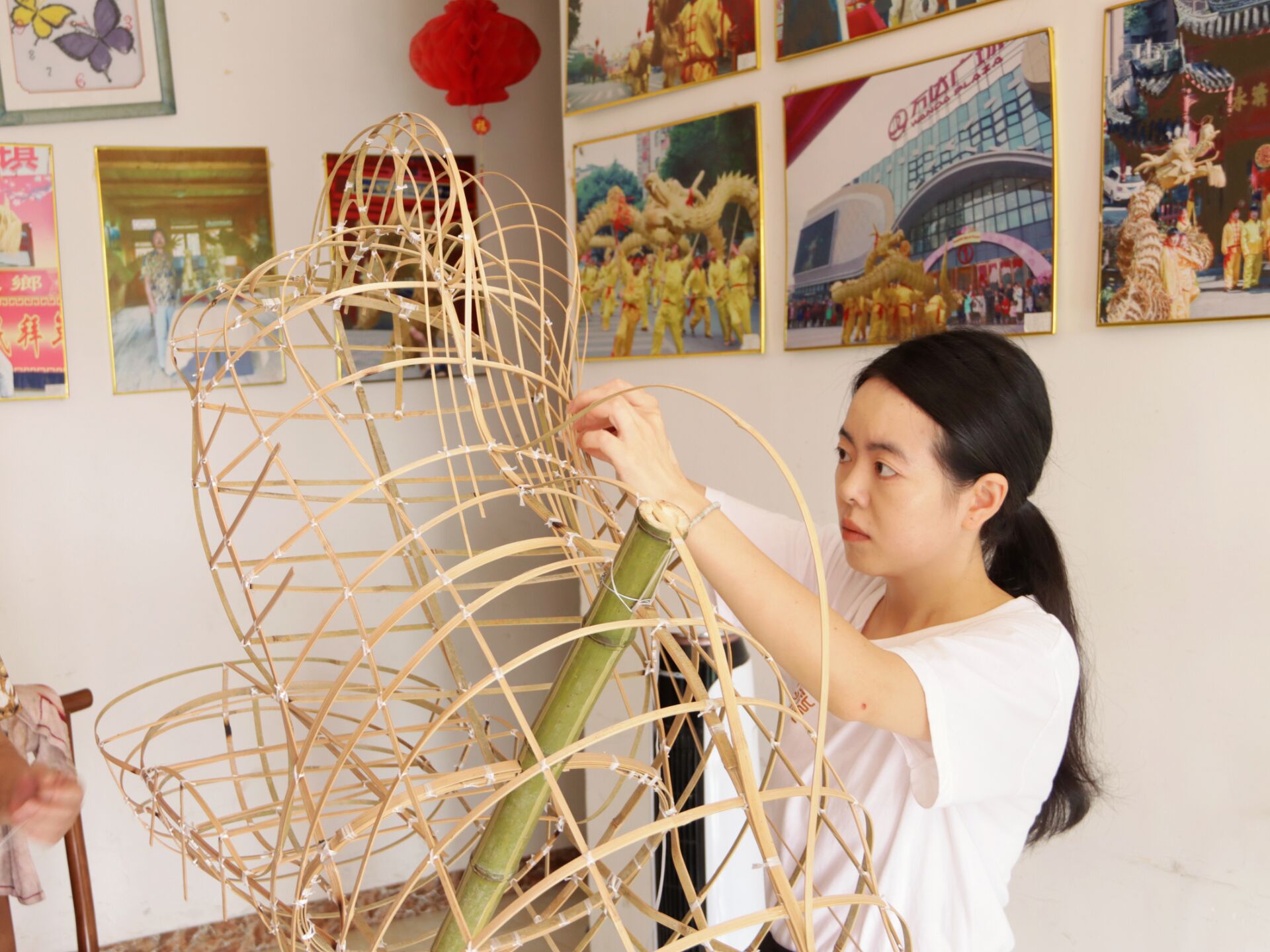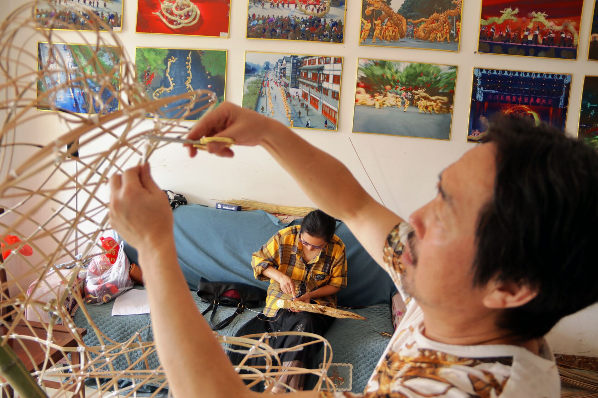 “金龍翻舞正飛騰,逐日追云氣勢升”。談及沐川草龍,其最鮮明的特征莫過于那亮黃色的稻衣,而這璀璨奪目的色彩正是源自精心挑選、無斑點稻草的巧妙編扎。稻衣下是由竹篾架起的骨架,環環相倚,支撐起設計精巧的龍頭、龍身、龍尾。概括來說:竹篾謂之內里,稻色謂之外形。訪談之際,麗燕老師正和煥彬老師編扎龍頭。龍頭骨架剛成,繁雜的結構一覽無余。談話間我們得知,草龍采用編、織、鑲、繞、纏等十多種工藝技巧,經過選材、制材、做骨架、上稻草、連接、上龍筋、點睛等多道工序才能成型。若是遇到骨架架構有誤,還得拆卸重建。光是一條正常大小的草龍,便要耗費匠人幾個月的心血。直面如此精美的工藝品,龍眼、龍須、龍角、龍鱗、龍爪活靈活現,處處凝結著傳統技藝人踔絕之能,感嘆贊美之情溢于言表。
