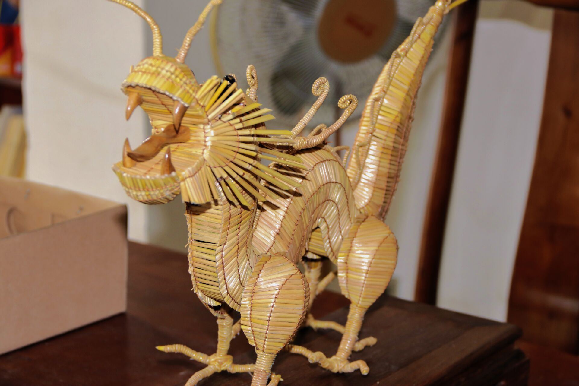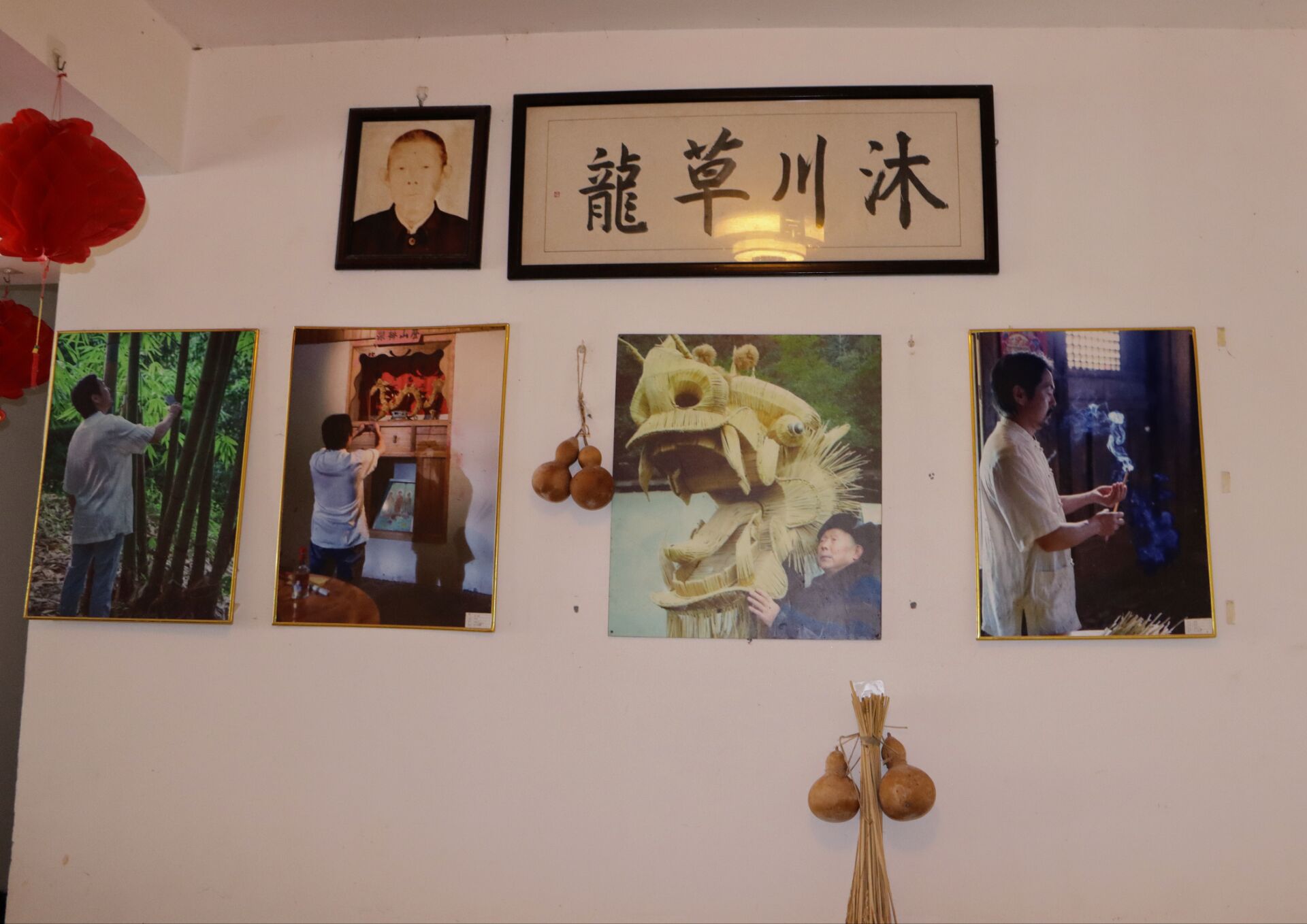 邁入工作室,第一眼便是高懸于墻上,遒勁有力書寫“沐川草龍”四個大字的作品。深邃濃厚的墨色,側映著旁邊的證書耀耀生輝,證書上嵌刻著:國家級非物質文化遺產·草編·沐川草龍。環顧四周,墻上還懸掛著一幅幅沐川草龍表演現場圖,木質書桌上精心擺放著衍生的文創手工藝品,尤其是那份“濃縮”草龍,可謂栩栩如生,引人入勝。麗燕老師面向我們分條析理的介紹草龍精致繁雜的制作工藝,每當講到撥人心弦之處,便深情的望著眼前骨架成型的龍頭。仿佛透過龍眼,穿越時光,看到了在草龍非遺傳承路上浮浮沉沉的自己,兢兢業業的自己,新時代與所有“草龍愛好者”共傳承共奮斗的自己。