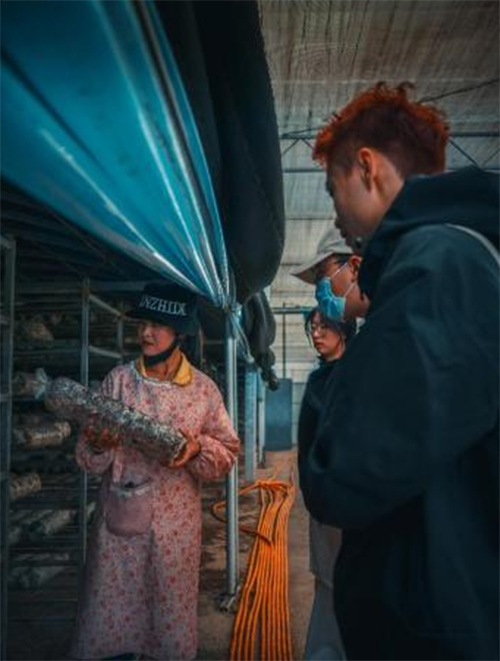 圖為團隊成員參觀采菇棚。賀天麒 供圖