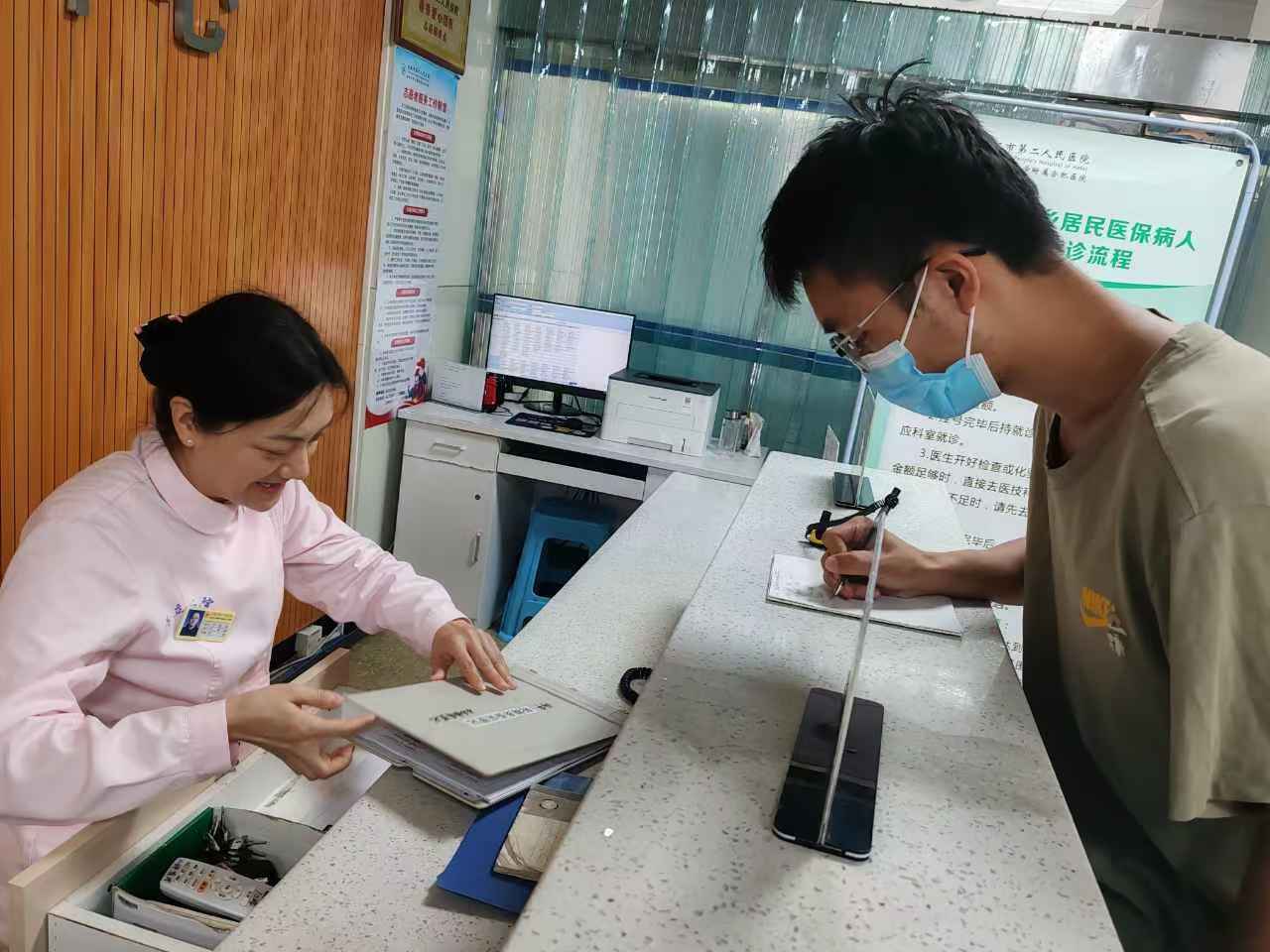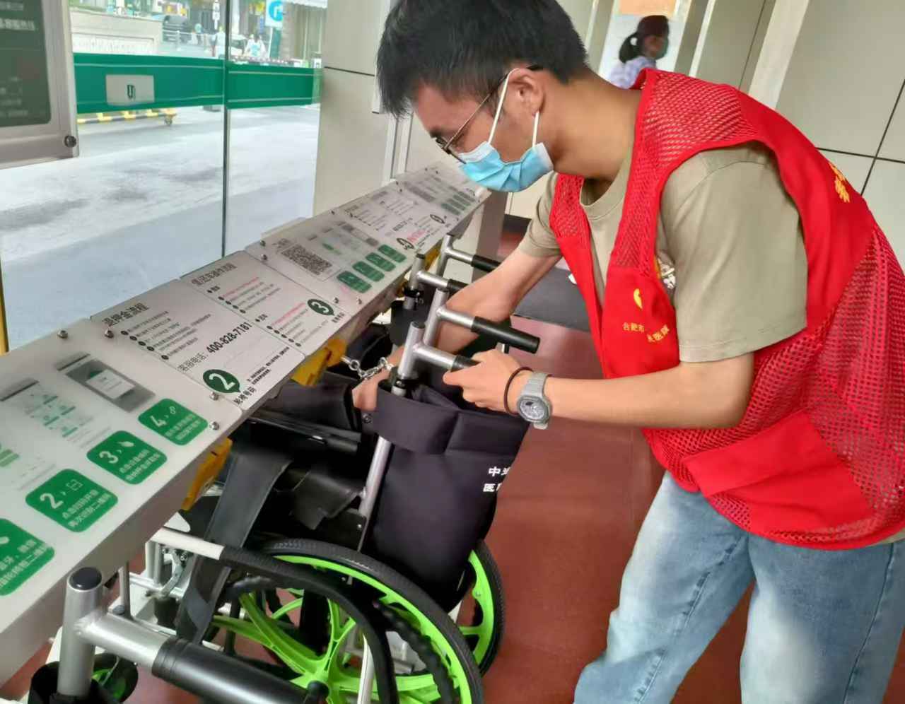 圖為志愿者幫助患者租借輪椅。王玉鵬攝
