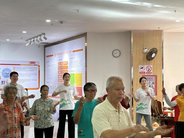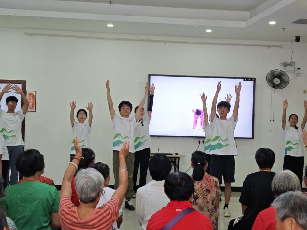 圖為實(shí)踐團(tuán)成員帶領(lǐng)老人們一起打八段錦。劉向杰 供圖