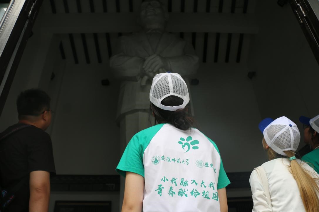 02 團隊成員瞻仰趙樸初雕塑 安徽師范大學(xué)苗颯颯供圖。