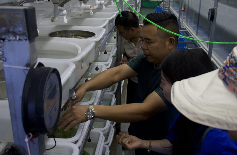 實踐團成員們參觀了金平家美源生態農業有限公司的本土黃鱔孵育基地和哈尼梯田“稻漁”綜合種養基地。公司執行董事曹香才詳細介紹了本地黃鱔苗、七星魚(蛇魚)苗、塘角魚(本地胡子魚)苗的科學孵化、科學養殖及經濟效益。