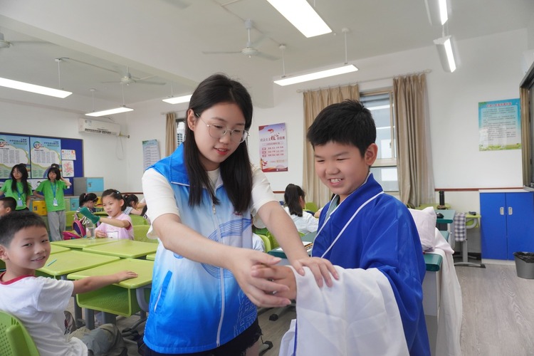 圖為社會實踐團隊員教學生如何調整水袖。 孫雨婕 供圖