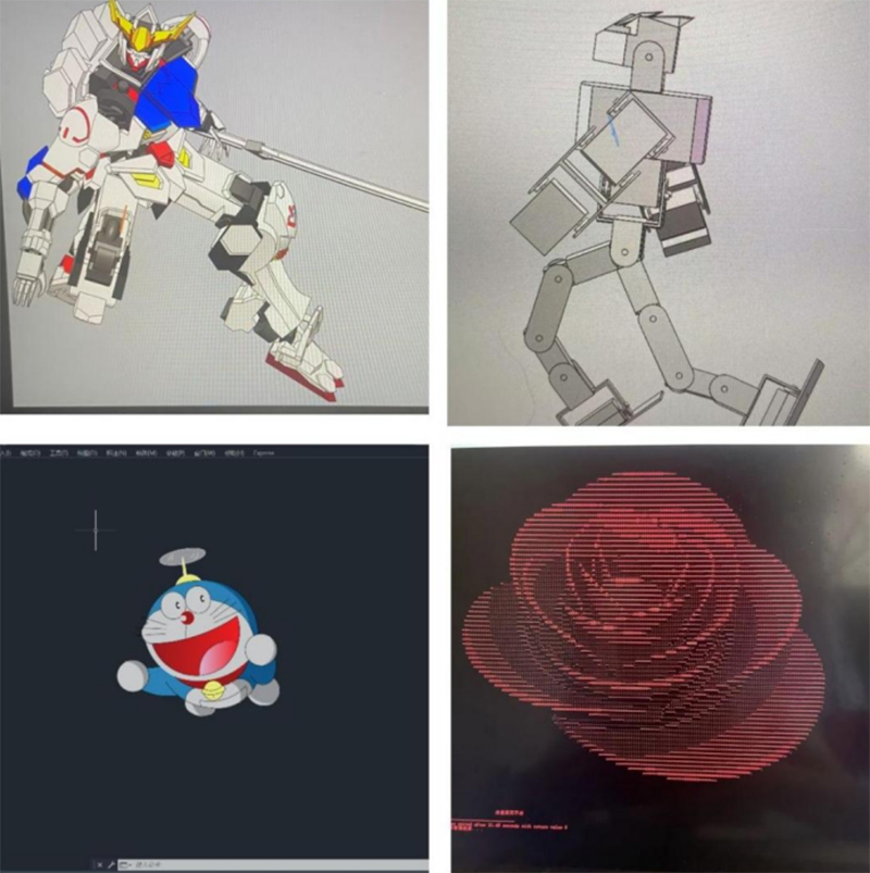第二部分是通過使用C++、python、CAD等編程或畫圖軟件,制作包括跳動的心臟、汽車模型、高達、動漫角色等有趣生動的作品。同學們在制作科技作品的同時逐漸熟悉了本專業所長,他們為了完成某個功能而投入軟件的學習,真正的把學習帶到了平常生活中。