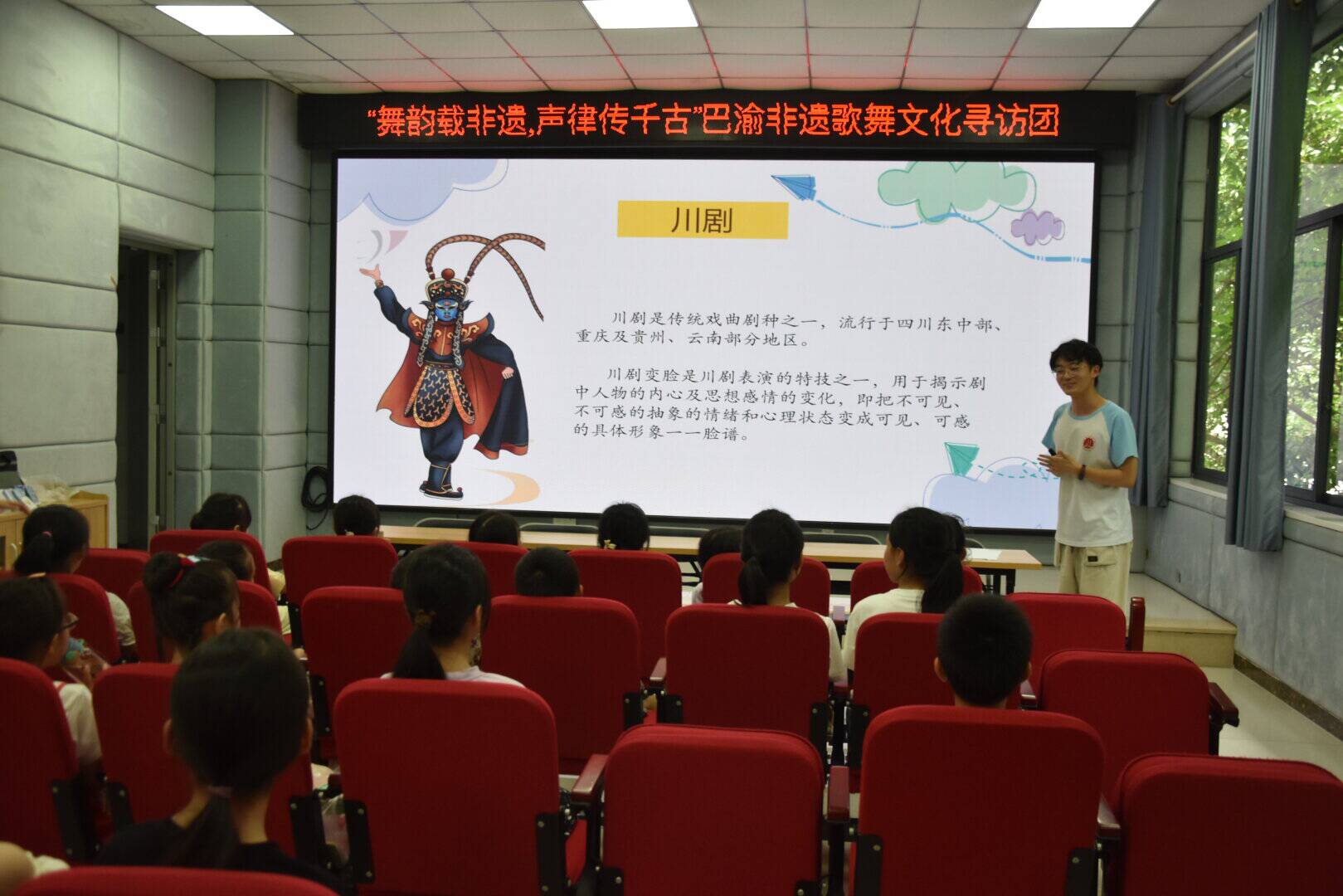 為了宣揚中華的悠久傳統文明,深化社會主義核心價值觀的培育與實踐,同時承傳華夏的卓越傳統手藝,2024年7月12日下午,重慶師范大學外國語學院“舞韻載非遺,聲律傳千古”巴渝非遺歌舞文化尋訪團走進了木洞鎮文化服務中心,和社區里的孩子一起感受川劇的魅力。