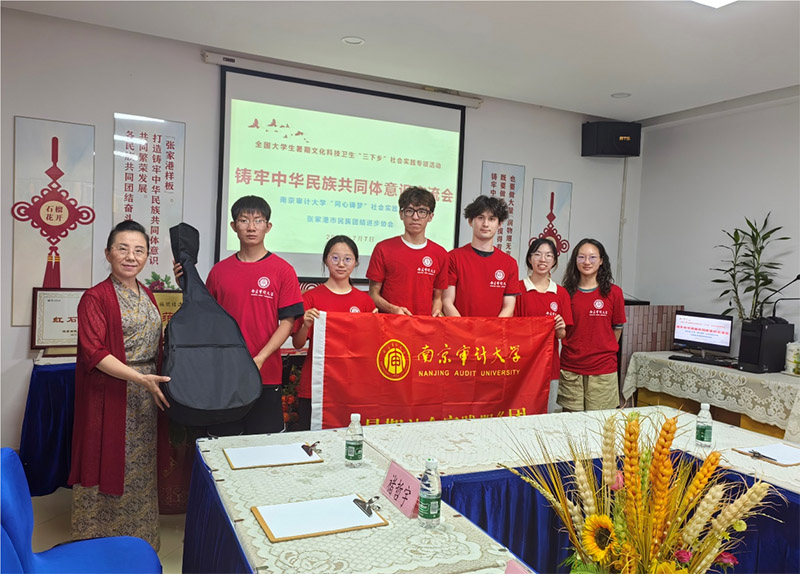 最后,格桑曲宗會(huì)長(zhǎng)向南京審計(jì)大學(xué)同心“鑄”夢(mèng)社會(huì)實(shí)踐小分隊(duì)中來(lái)自新疆的同學(xué)捐贈(zèng)了一把象征著民族團(tuán)結(jié)的紅石榴吉他。格桑曲宗會(huì)長(zhǎng)深情寄語(yǔ),愿這把紅石榴吉他能奏響民族團(tuán)結(jié)的悠揚(yáng)旋律,讓南審的學(xué)子們都能用心聆聽(tīng)那石榴花開(kāi)的聲音,在追求夢(mèng)想的路上,不忘初心,牢記使命,共同書(shū)寫(xiě)中華民族團(tuán)結(jié)進(jìn)步的新篇章。
