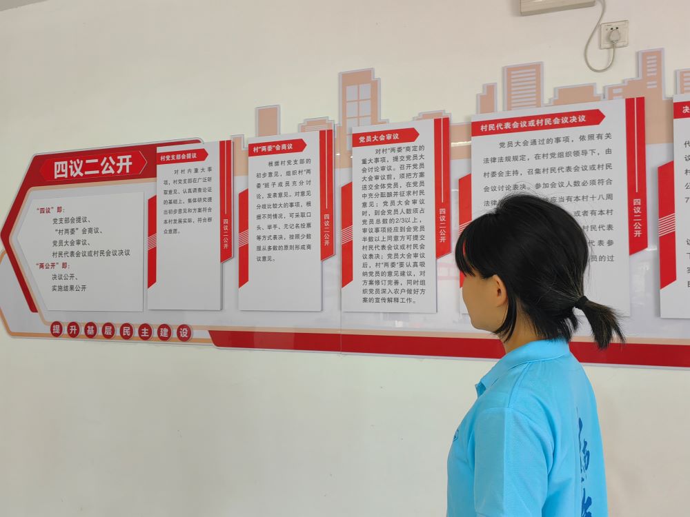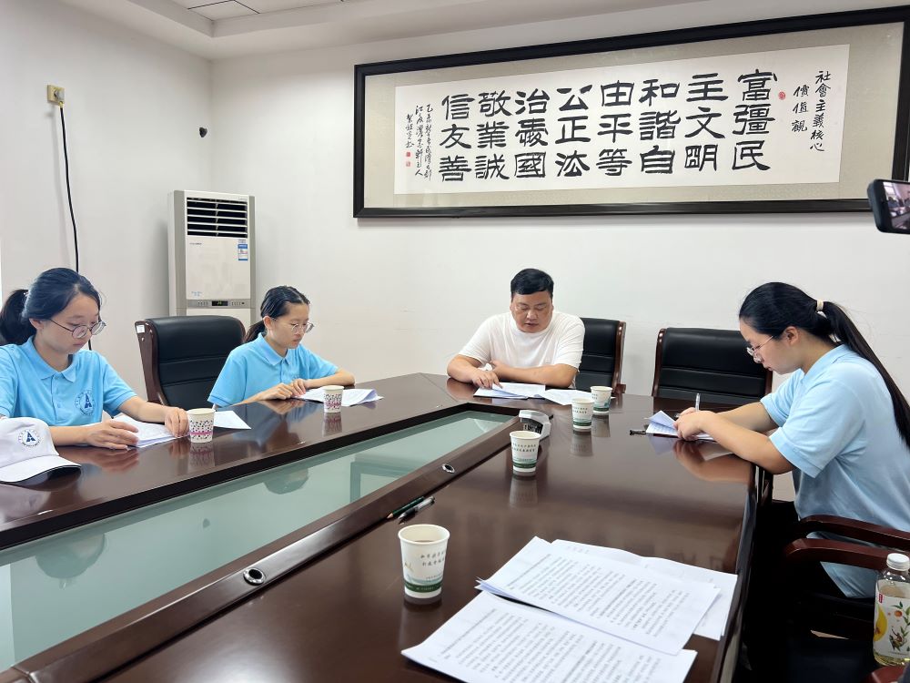 實踐隊員們首站抵達群益村黨員群眾服務中心,與工作人員進行了深入交談,了解群益村的基本情況、發展歷程及面臨的挑戰。工作人員向實踐隊員們介紹了群益村特別的“四議二公開”制度,群益村秉承“五共”理念,念好“富、秀、安”三字經,依托梁子湖生態稟賦,把鄉村旅游與美麗鄉村建設有機結合,充分調動群眾的創造性,最大程度發揮群眾自治作用,使村民由旁觀者轉變為參與者、決策者、享受者。