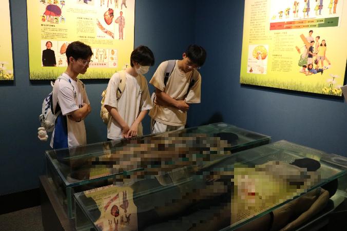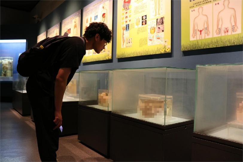 浙江省自然博物館內(nèi)陳列的,多與自然遺產(chǎn)和生物多樣性有關(guān),例如魚類、鳥類、兩棲類、爬行類等有脊椎動物。而作為醫(yī)學生,成員們著重參觀了位于博物館二層的青春教育展覽館。步入展覽館,各個器官的標本陳列在眼前:肝、腎、端腦、腦干腹側(cè)面觀等,保存技術(shù)良好,結(jié)構(gòu)清晰易觀察。在這個展覽館中,生殖系統(tǒng)與胚胎的展示占了展示標本的大多數(shù),一方面觀眾感慨著孕育生命的奇跡,另一方面這也引發(fā)對性教育普及重要性的思考。