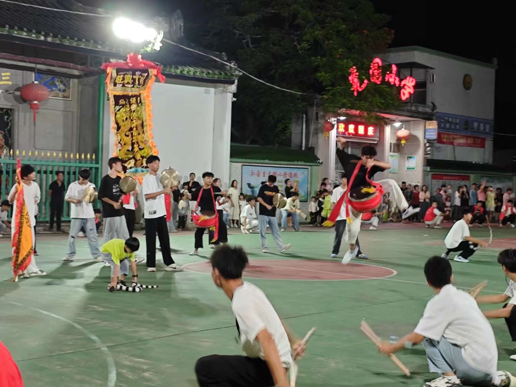 英歌舞當晚7:30,潮匯小隊來到了澄海湖心進行對英歌舞路演調研。表演開始,鼓聲響起,英歌舞的表演者們整齊一致地敲動手中的鼓棒,圍成一圈,鏗鏘有力整齊一致地發出“嚯”的一聲,接著進行舞蹈。表演英歌舞的現場,大部分都是十五、十六歲的年輕人,最年輕的小朋友是八歲,歲數不同,但一致的還是他們對英歌舞熱忱的心,在表演過程中,他們拼盡全力,揮灑著汗水,盡可能地將每一個動作做到最好、散發獨屬于潮汕非遺的光輝。