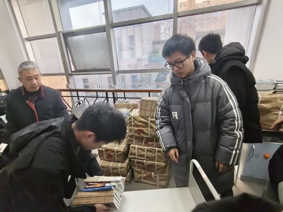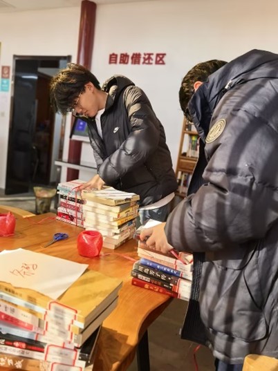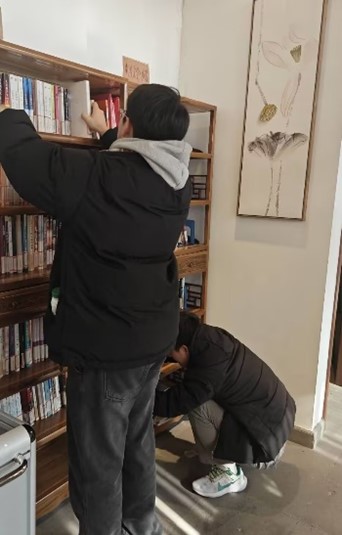 與此同時,在上河書房,“陽光志愿團”的同學們承擔整理書架和打包書本的任務,他們耐心細致地將每一本書分類歸位,確保書籍整齊擺放,方便讀者查找。為了完成這一工作,他們不僅需要細致地核對書籍分類編號,還要時刻保持對書架整體布局的關注,力求每一個細節都做到完美。同學埋頭在書架間忙碌,仔細核對書籍的標簽和編號,將同一類別的書籍歸攏放在一起。