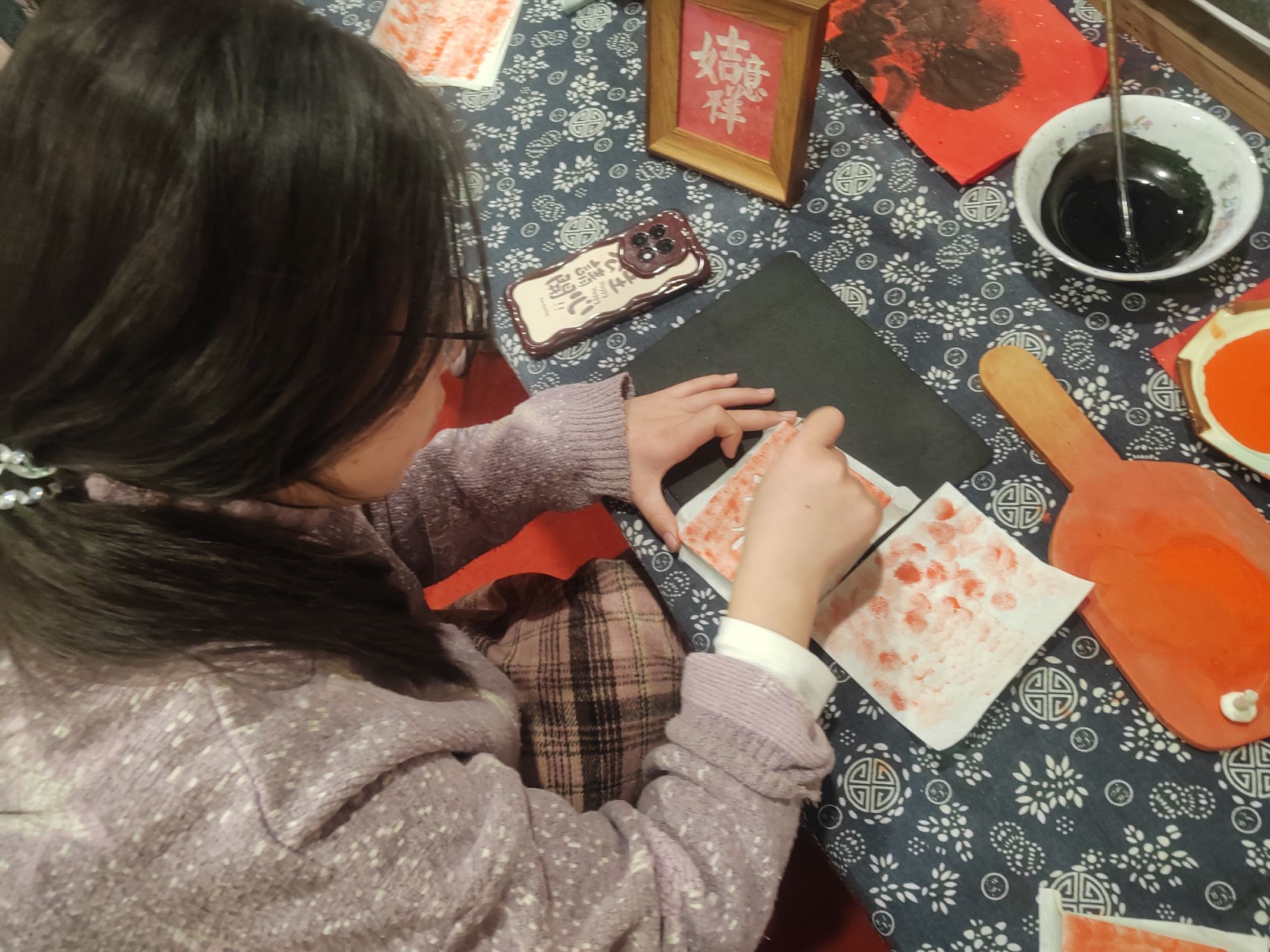 圖為實踐隊隊員在專業人員指導下學習拓印技巧