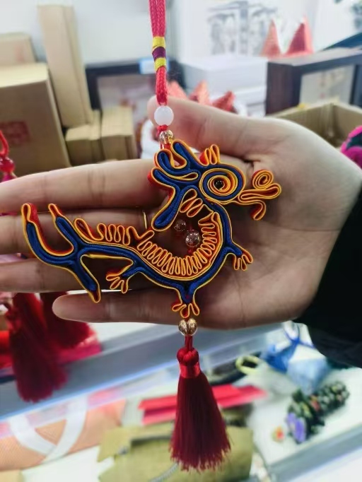 劉氏盤扣作為省級非遺項目,其傳承人劉冬梅一直致力于盤扣技藝的傳承和傳播。她不僅將盤扣技藝與青花瓷結合,以“制作精巧、寓意吉祥、款式豐富”為特色的“瓷韻”系列多功能布藝包在山東省旅游商品大賽中榮獲金獎,還不斷創新,例如在龍年將至時,與團隊一起創作出二十多款造型各異的龍年盤扣,并做成可隨身佩戴的飾品,深受大眾尤其是年輕人的喜愛。這些龍盤扣將龍的姿態、神態,甚至龍鱗細節盡數詮釋,或憨態可掬,或威風凜凜,盡顯莊重大方,為新春增添了特別的儀式感與氛圍感,也讓人們看到了傳統盤扣與現代審美結合的更多可能性。