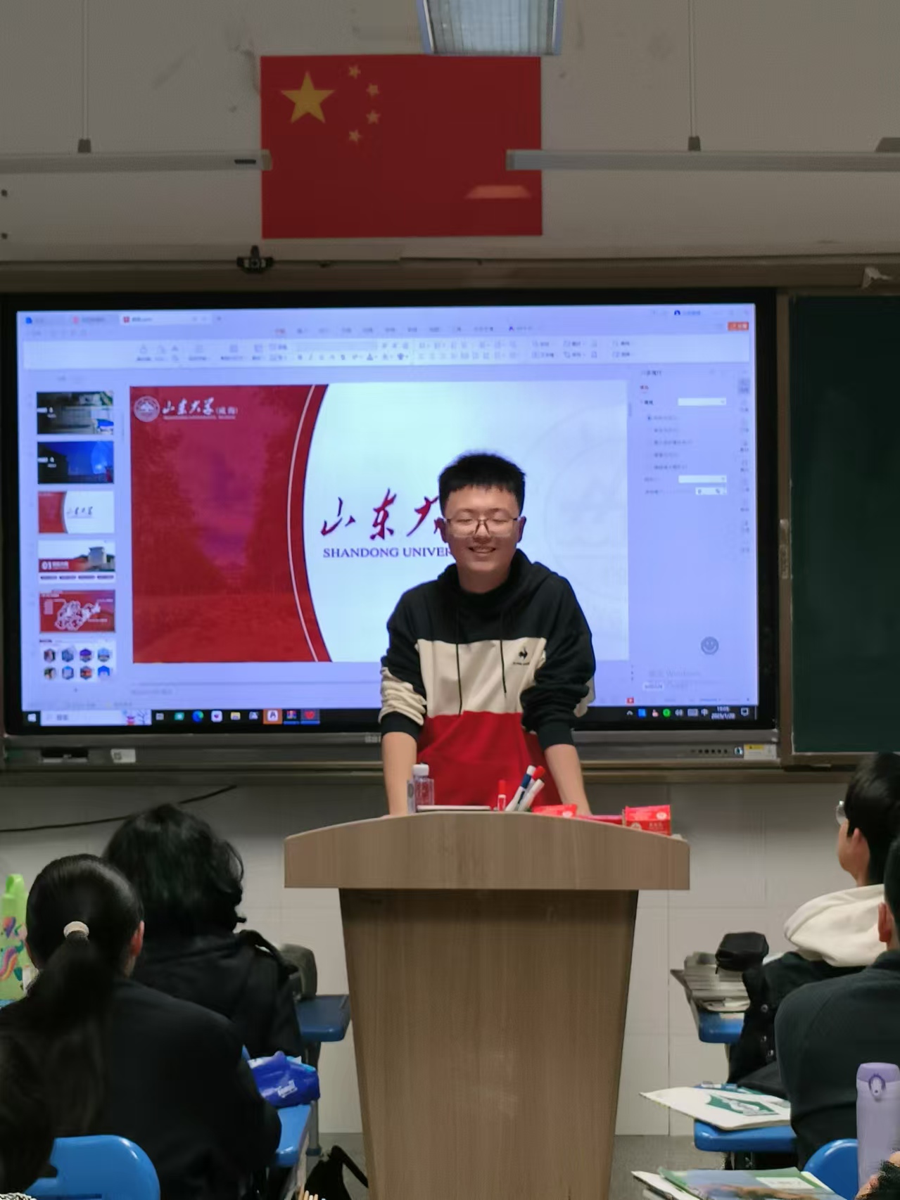 隨后,我們來到高三教室,與學弟學妹們進行面對面的交流。作為過來人,我們深知高三學子面臨的緊張與壓力,因此希望通過自己的經驗分享,為他們提供一些幫助。我首先介紹了山東大學威海校區的校園環境、學科優勢和特色活動。威海校區依山傍海,風景秀麗,學術氛圍濃厚,是一所兼具實力與魅力的高校。我還特別提到,威海校區的國際化程度較高,為學生提供了豐富的海外交流機會,這讓我受益匪淺。