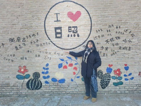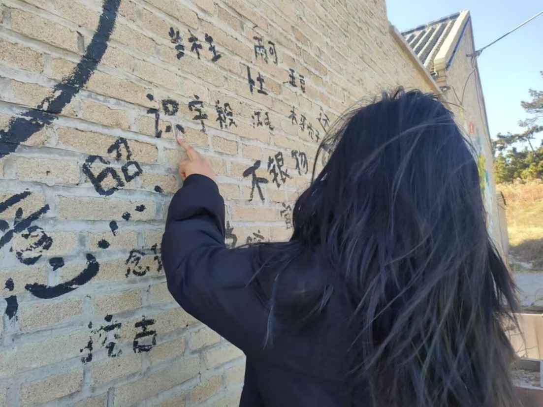 圖為實(shí)踐隊(duì)隊(duì)員觀察日照方言墻 覓音尋根實(shí)踐隊(duì)長 李樂聰 供圖