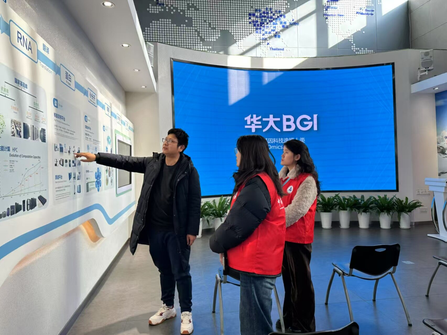 圖為周玉杰為實踐隊成員介紹華大基因的技術平臺和相關設備。黃鴿 攝