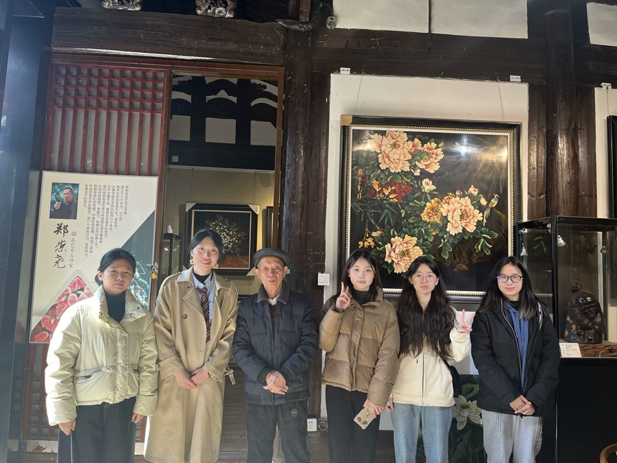 移步至百里之外的鄭崇堯工作室,恰逢鄭老先生于工作臺前作畫,實踐隊隊員們有了近距離觀摩的機會,并有幸同鄭老先生合影留戀。在晨光初照的工作室內,鄭崇堯先生身著一件素色長衫,仿佛與這古色古香的氛圍融為一體。他的面容平靜而專注,眼神中透露出對藝術的無限熱忱。室內陳設簡單,卻透著一股文人氣息,案頭擺放著各式毛筆、墨硯和一疊宣紙,旁邊是一盆翠綠的文竹,為這空間增添了幾分生機。