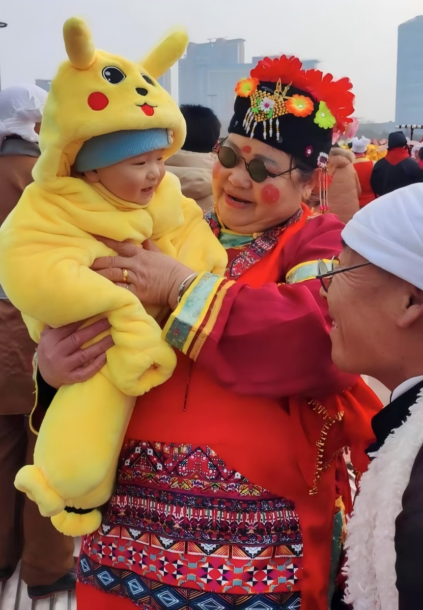 表演隊的老奶奶走到觀眾跟前與小朋友玩樂