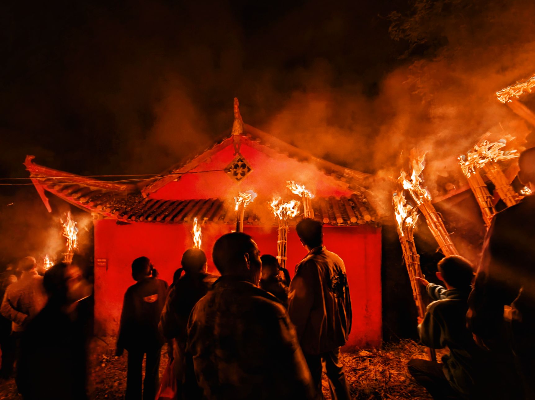 當夜幕降臨,藥王金身歸位,男女老少抬著火把照亮前行的路,將菩薩廟圍一圈照亮,實踐隊員也參與其中。年輕人拽著本地豬繞廟左轉三圈右轉三圈,感謝藥王菩薩對村民世世代代的佑護。數箱煙花爭先綻放,述說著世代平安、人丁興旺的喜悅。這一刻,過去與現在、神圣與世俗、傳統與現代,在山村的星空下達成奇妙的和解。這種文化共生的智慧,或許正是中華文明綿延千年的密碼。