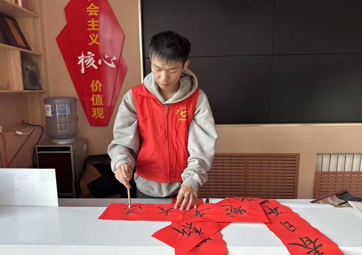 志愿者劉凱澤寫春聯 侯信慈 供圖