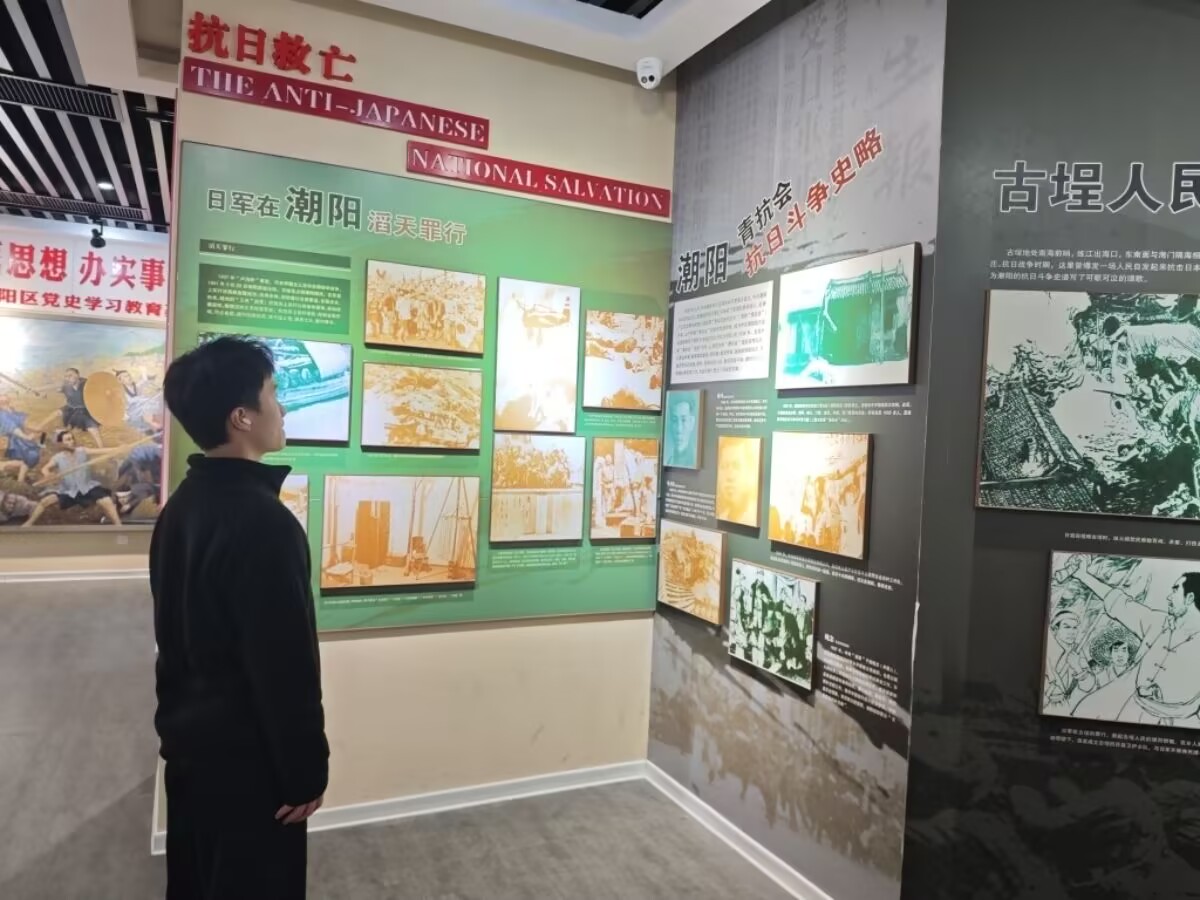 隨后,小隊進入二樓。在博物館的二樓,記錄著潮陽人民抗戰奮斗的歷史,記錄著革命先烈的的不屈,展示這近現代抗日的珍貴照片和實物。實踐團成員在講解員繪聲繪色的講述中,都仿佛置身于歷史長河之中,看到革命先烈的英勇無畏。“文化之旅”小隊成員駐足在潮陽革命先輩抗日救亡的事跡前,看到先輩為抗日做出的奮斗與犧牲,隊員面露崇敬與欽佩;看到日軍在潮陽做出的惡行,咬牙切齒,恨不得食其肉,飲其血。