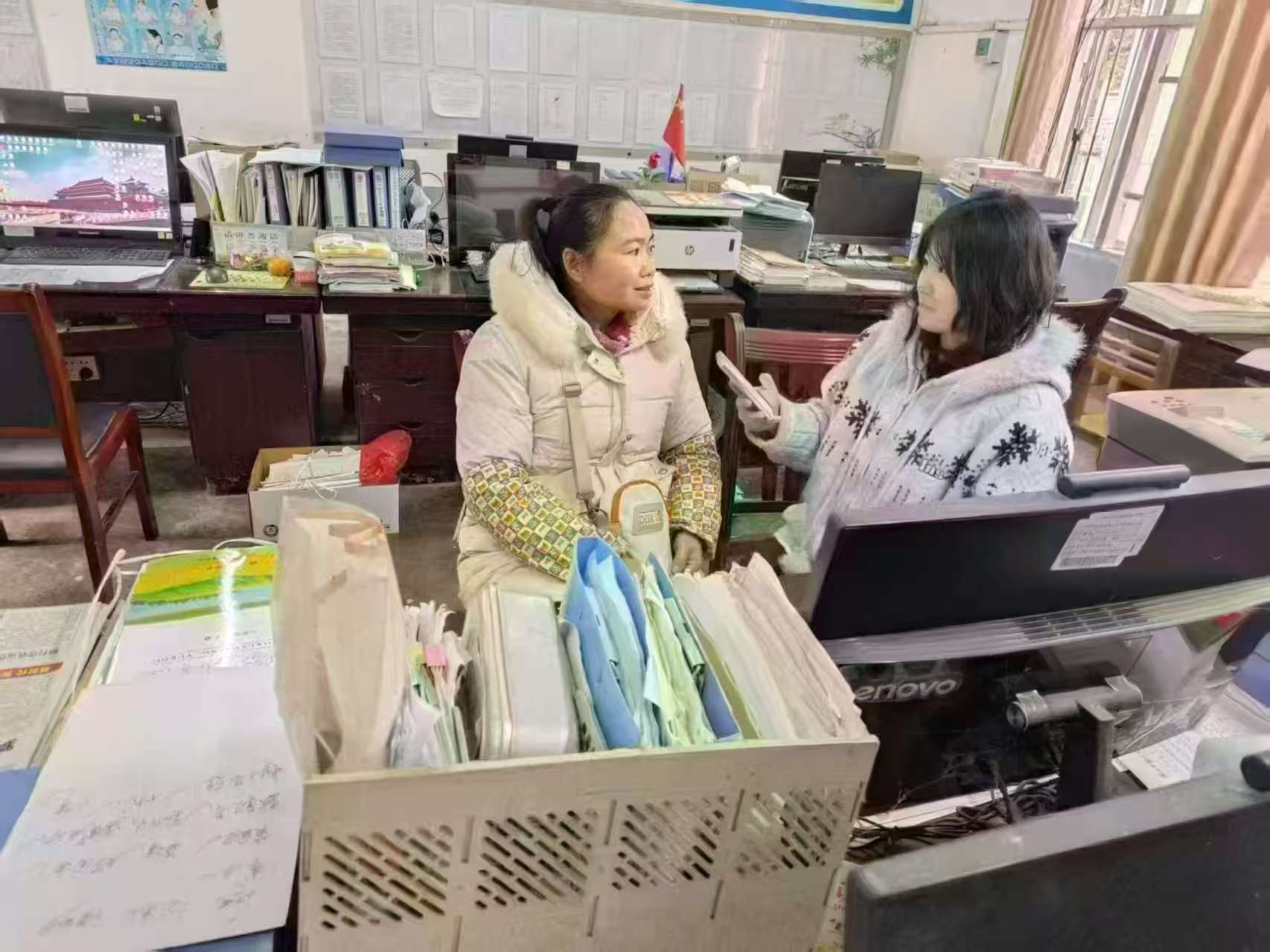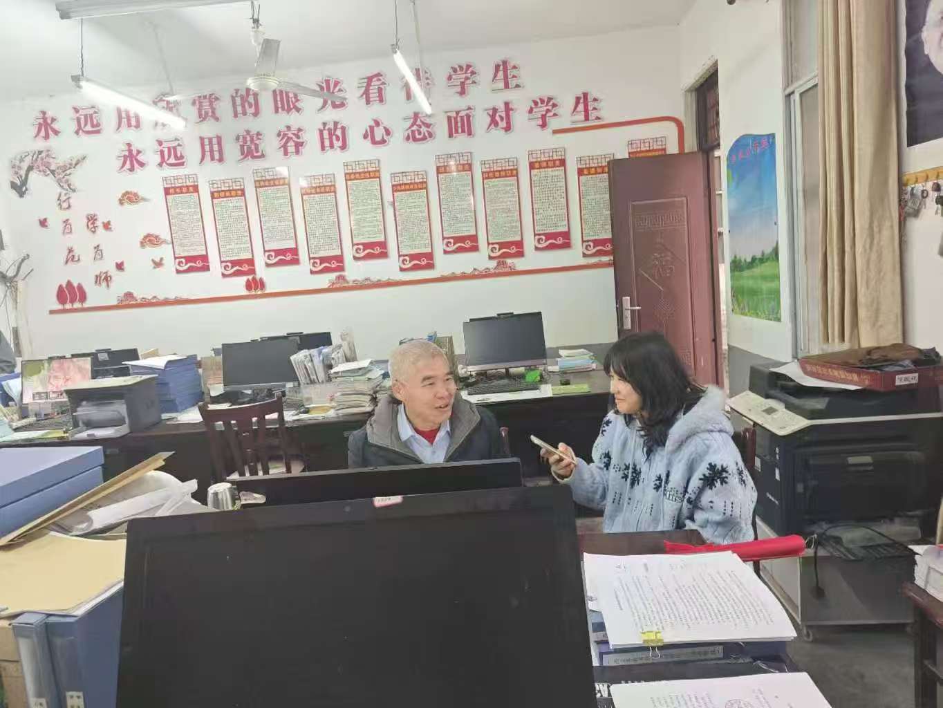 圖為團隊成員在勤蘭小學教師辦公室采訪包鳳英、韋建鋒老師