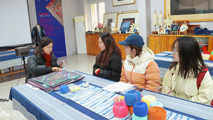 在工作室里,團隊成員認真聆聽李老師的苗繡小課堂,了解到苗繡的淵源歷史。上個世紀60、70年代,苗家女孩自五六歲記事起便跟隨母親學習刺繡,伴隨她們的一生。并以其刺繡手法的精細作為一個標準,看看這家女孩是否能干,是不是心靈手巧會過日子。為了制作一件華美的繡服,繡娘們不惜花幾年甚至十幾年的時間去鉆研平繡、雕繡、套袖、鎖繡等多達20多件的針法和技法。