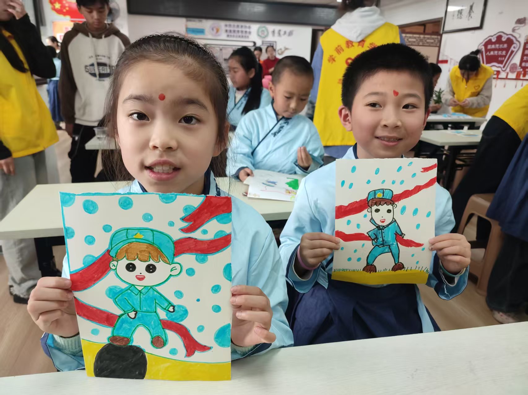 志愿者們繪聲繪色地講述雷鋒故事,活潑的語調、生動的動作,讓雷鋒的形象鮮活地呈現在孩子們眼前。故事講完,志愿者一句“你的愿望是什么”,瞬間激發了孩子們的熱情。“我要做像雷鋒叔叔那樣的好人!”“我長大后要去當兵,保家衛國!”稚嫩的童聲里滿是對未來的向往,紅色的種子就此在孩子們心中種下。隨后,在志愿者引導下,孩子們拿起畫筆,用心勾勒出心中軍人的模樣,每一筆都傾注著對軍人的敬仰。