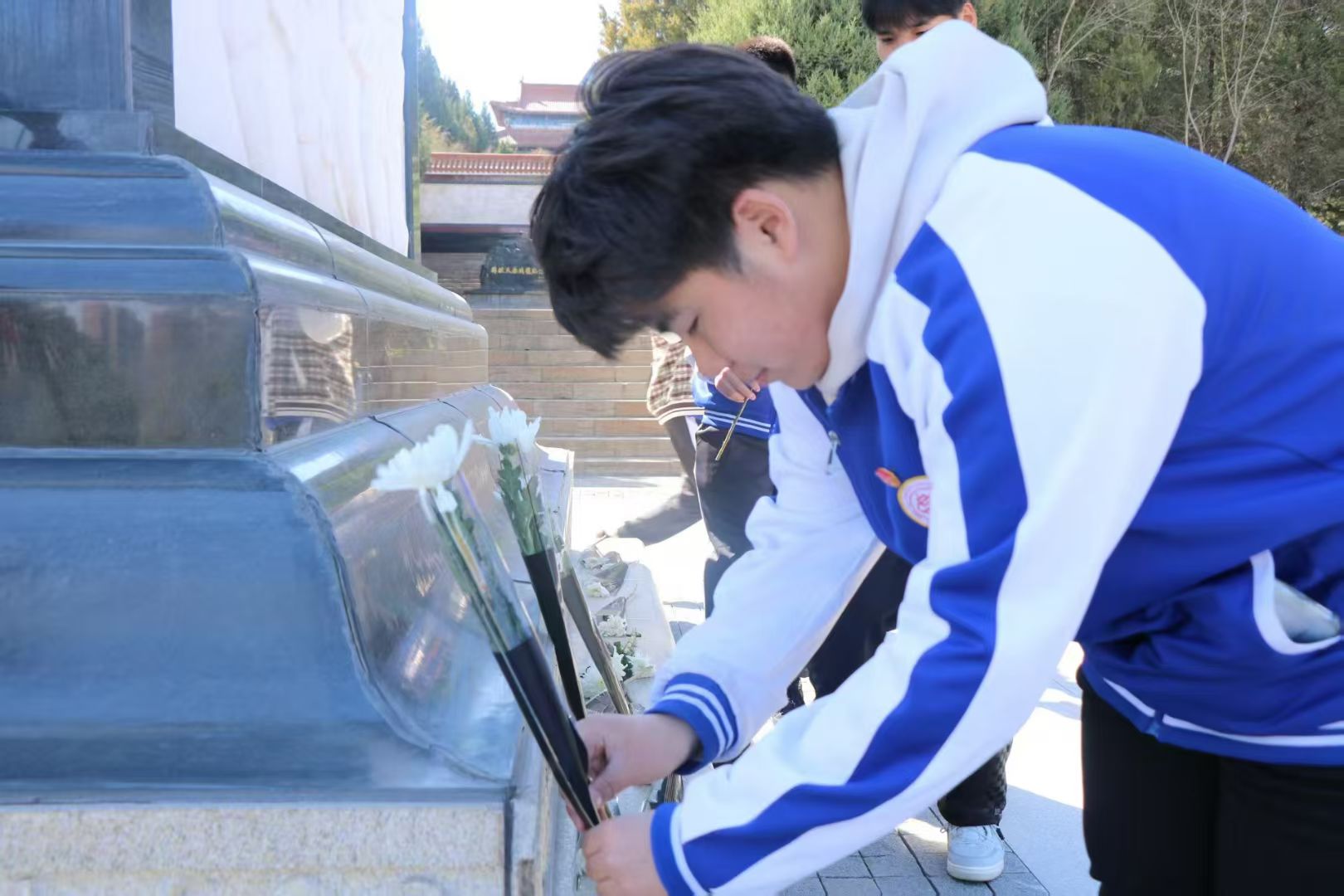 活動現場莊嚴肅穆,全體師生整齊列隊,向烈士紀念碑行三鞠躬禮并集體默哀。師生代表共同敬獻花圈,仔細整理緞帶表達深切追思;伴隨《獻花曲》的悠揚旋律,學員們手持白菊緩步繞行紀念碑,逐一獻花致敬英魂。隨后,學生代表以沉浸式講述還原革命先烈浴血奮戰的事跡,帶領師生重溫崢嶸歲月;全體團員面向團旗高舉右拳,鏗鏘誓言響徹陵園,激蕩賡續紅色血脈的堅定信念。實踐環節中,學員們分組俯身細致擦拭烈士墓碑,用行動守護紅色豐碑的溫度與尊嚴。活動尾聲,師生走進革命烈士紀念館,通過泛黃書信、戰地照片等珍貴史料,沉浸式感悟革命征程的壯闊史詩。
