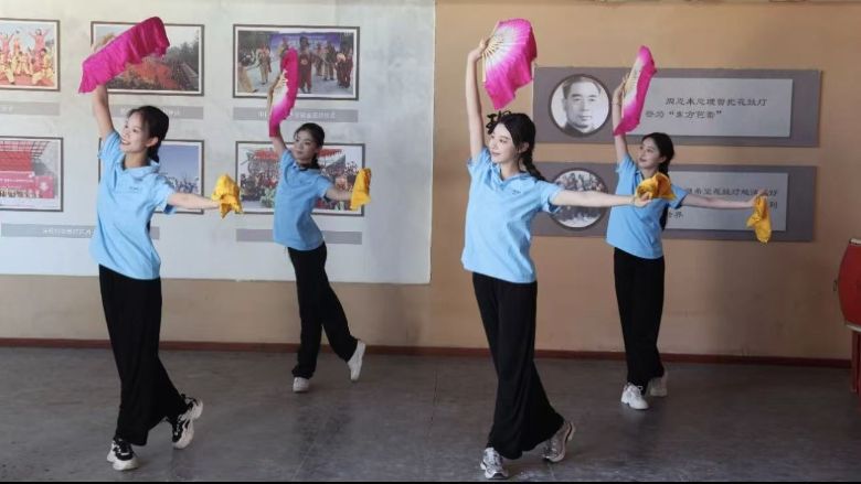 清晨,團隊成功抵達了充滿現代化氣息的馮咀子花鼓燈生態保護村。走進傳習所內,我們看到所內珍藏著現今“馮派”傳承人譜系與許多歷史資料。朱老師向團隊成員們逐一介紹館內珍藏的照片,圖片上記載著從建國初期至今的各大演出盛況。扇花飛舞,鑼鼓升平,舞蹈演員們姿態矯健,身段柔美,F場的氣氛洋溢著熱鬧歡快的節慶氛圍,傳遞出安徽花鼓燈濃厚的歷史底蘊與文化的魅力。