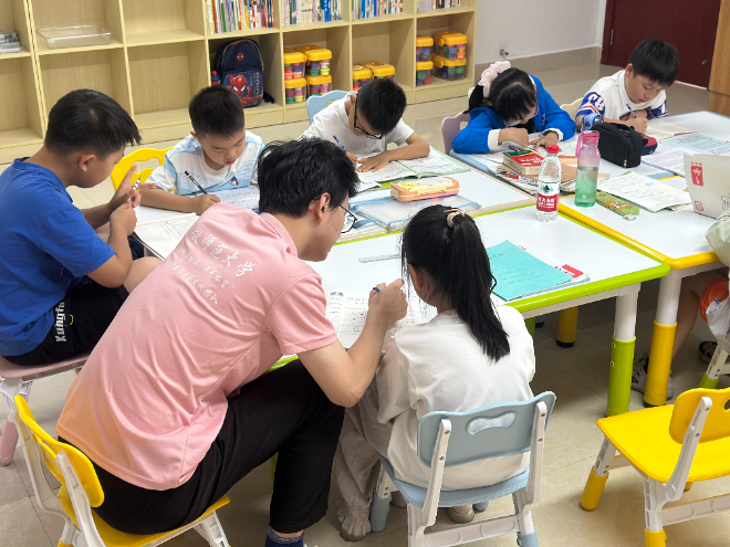 “低頭趕路,敬事如儀。”在活動正式開展的第三天,小朋友們依舊滿懷期待、如約而至,早上9點的教室里,他們端坐如松,課桌上整齊擺放著作業本與文具。“老師,這一題我有些不太會。”這是小朋友們追求甚解的話語。團隊教學組的老師們聞聲而動,迅速來到小朋友們的身邊答疑解惑,從數學算式的層層推演到漢字書寫的規范指導,老師們悉心教導,化身成為“課業加油”的最強助手。“我會了!謝謝老師。”孩子們激動的話語,不僅是對難題被攻克的欣喜,也飽含著對師大老師的感激。這份師生間的互動,讓知識得以傳遞,是對暑期實踐社會意義的生動演繹。