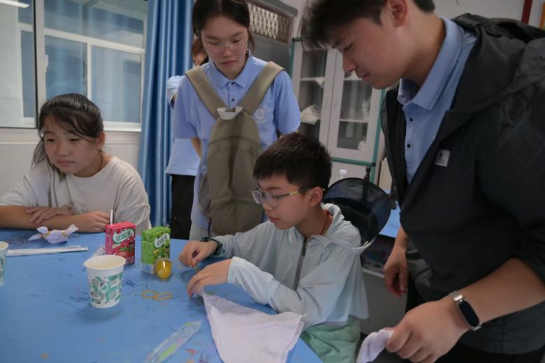 本次安徽理工大學志愿者扎染支教行動,既是非遺技藝向鄉村課堂的“創造性轉化”,亦是高校美育資源下沉的“創新性實踐”。以靛藍為媒介,志愿者將抽象文化基因轉化為可觸可感的少年記憶 ;以素布為畫板,孩童在捆扎浸染間印證“知行合一”的創造力量。志愿者將青年智慧注入非遺傳承——在折疊捆扎中解碼古老技藝,于浸染氧化間傳遞美育薪火。當非遺技藝通過“青年之手”扎根鄉村課堂,我們清晰看到:文化傳承的星火,正由 “志愿藍”與 “扎染青”共同編織,在鄉土大地上奔涌出“青春為證”的永續力量。