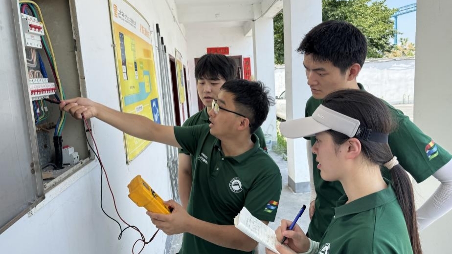 ▲能源組團隊成員測試光伏板性能 項目負責人介紹,該分布式光伏項目作為“整縣推進”試點工程,已接入?yún)^(qū)域能源網(wǎng),年發(fā)電量達150萬千瓦時,相當于減排二氧化碳1200噸。團隊結合《新型電力系統(tǒng)發(fā)展藍皮書》分析:“分布式光伏作為能源體系的‘毛細血管’,其與建筑場景的融合正是‘源網(wǎng)荷儲’基層實踐的關鍵一環(huán)。”現(xiàn)場可見,在非居住區(qū)域,光伏板布局與山體朝向形成科學適配,而在前期調研過程中,團隊成員也發(fā)現(xiàn)在人員密度較高的居住區(qū)域已嘗試將光伏板作為屋頂遮陽構件,說明太陽能的使用已經(jīng)初具規(guī)模,也初步體現(xiàn)了“光伏建筑一體化”的變化趨勢