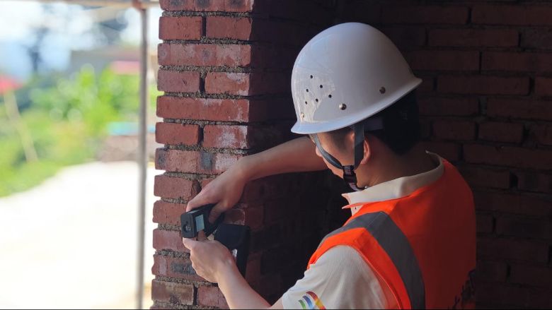 檢測工作采用技術診斷與入戶調研相結合的模式。團隊率先對在建農房實施評估,通過專業設備檢測砌體強度與結構尺寸。針對村民反映的墻體裂縫問題,劉濤副教授現場指出:"砂漿流失導致磚塊松動,需及時更換受損部位。"經全面檢測,該房屋砌塊強度、砂漿強度等指標均符合規范要求,結構尺寸布置合理。