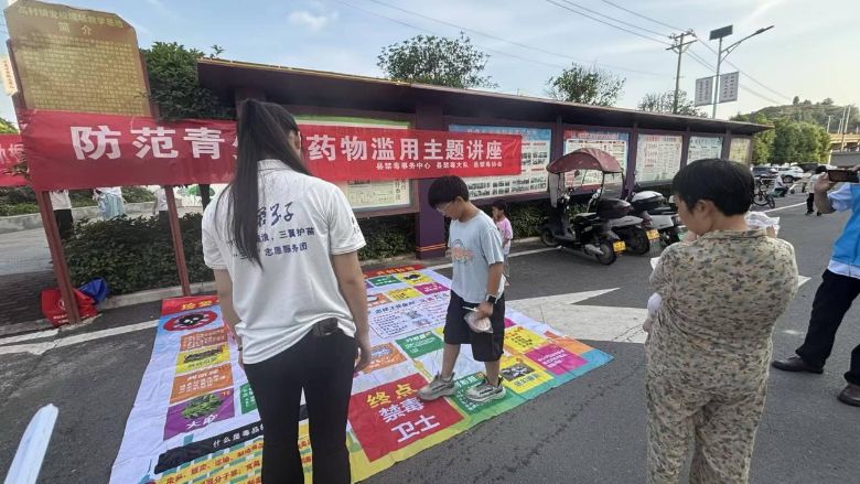 活動當天,社區外面布置了許多禁毒道具,桌面上整齊擺放著各類毒品仿真模型,包括海洛因、冰毒、搖頭丸等常見毒品。這些高度還原的毒品模型,吸引了小朋友們好奇的目光。志愿者們圍繞毒品的外觀特征、成癮機制和嚴重危害,用通俗易懂的語言向小朋友們進行講解。“小朋友們,你們看這個像冰糖一樣的東西,可不是能吃的糖,它是非常危險的冰毒,一旦沾染,就會對身體造成極大的傷害。”志愿者一邊指著冰毒模型,一邊耐心地向小朋友們介紹。通過這種直觀的展示,小朋友們對毒品的“真面目”有了更清晰的認識,紛紛表示以后看到類似物品一定會提高警惕。
