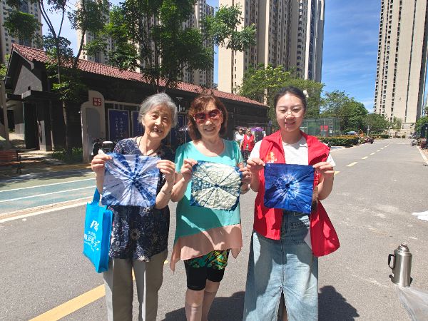 非遺扎染不僅是技藝的傳承,更是民族文化基因的延續。藝術設計學部志愿者們將其帶入社區,通過“手把手教學”“面對面展演”的方式,讓老年人在參與中重溫文化記憶。此舉以社區為陣地,構建了“非遺保護,老年關懷,文化傳播”的三維實踐模型,將青年志愿服務與老年群體關懷深度融合,成為新時代青年響應國家文化戰略,助力積極應對人口老齡化,踐行社會主義核心價值觀的生動注腳,在社會治理與文化傳承的坐標系中樹立起鮮明的價值標桿。