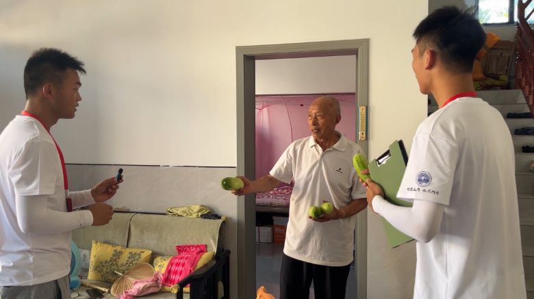 “劉昌毅將軍故里七里坪鎮馬鞍石灣歡迎您”,紅字白墻的標語,是故里給我們的第一張“名片”。在走訪數戶人家后,我們終于尋得劉昌毅將軍的親侄子劉爺爺。老人的熱忱如盛夏驕陽般灼人,幾番盛情相贈之下,實踐隊隊員們各自收獲了他親手栽種的黃瓜。那是帶著泥土氣息的質樸饋贈,更似將軍家風里“清正純粹”的滋味在舌尖流轉。