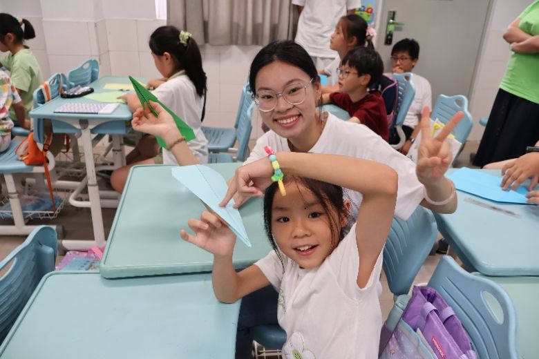 10日下午,實(shí)踐團(tuán)一行來(lái)到位于浦東新區(qū)的臨沂二村小學(xué),為該校暑期托管班學(xué)生帶來(lái)一場(chǎng)生動(dòng)的航空航天知識(shí)科普教育活動(dòng)。課堂內(nèi),實(shí)踐團(tuán)成員程云姝和劉子豪分別圍繞航空、航天主題為小朋友們介紹飛機(jī)飛行和火箭發(fā)射基本原理,并帶領(lǐng)小朋友們手折紙飛機(jī)、組裝水火箭。操場(chǎng)上,伴隨著小朋友們的歡聲笑語(yǔ),紙飛機(jī)和水火箭與他們的空天夢(mèng)一起飛向廣闊天空,奔赴夢(mèng)想征程。