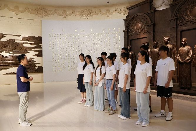 實(shí)踐團(tuán)一行瞻仰了中共一大代表群像浮雕,參觀了《偉大開(kāi)端——中國(guó)共產(chǎn)黨創(chuàng)建歷史陳列》。“前赴后繼、救亡圖存”、“風(fēng)云際會(huì)、相約建黨”、“群英匯聚、開(kāi)天辟地”等專題展區(qū),陳列著大量實(shí)物和圖片,有的還有雕塑和沙盤,師生們一邊聽(tīng)取介紹,一邊詢問(wèn)細(xì)節(jié)。