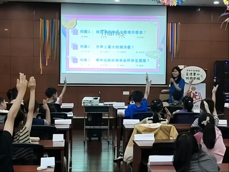 9時,化身“海洋知識小導師”的團隊成員潘留美同學,為孩子們帶來了一場別開生面的海洋科普盛宴。課上,她借助精心準備的PPT與視頻資料,生動講解了海洋基礎知識、海洋生物的趣味知識以及海洋生態保護等內容,并穿插趣味問答,與孩子們展開熱烈互動。孩子們踴躍舉手,積極回答問題,展現出對海洋世界的濃厚興趣與扎實知識儲備。課后復習環節,孩子們更是爭先恐后地復述知識點,課堂效果顯著。為鼓勵孩子們的學習熱情,團隊成員邱天翔還為表現優異的孩子分發了獎勵,進一步激發了他們探索海洋奧秘的積極性。