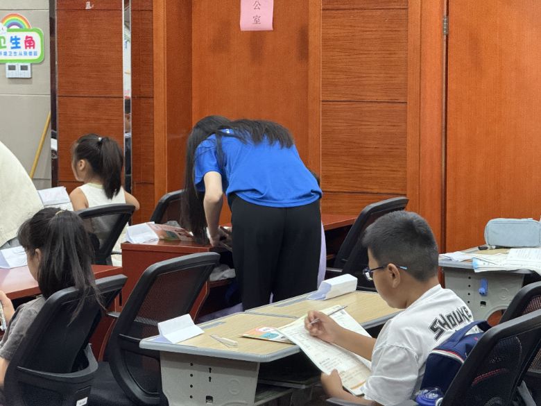 上午8時,團隊成員抵達社區教室后迅速進入狀態,主動承擔起班級巡邏的任務,協助老師維護班級秩序,耐心幫助孩子們整理暑假作業,并解答學習疑問。同時,恰逢班級營建“圖書角”,團隊成員分工明確,仔細檢查書籍是否署名,并對書籍進行分類整理,為營造書香班級貢獻力量。這一環節不僅幫助孩子們養成良好的學習習慣,更激發了他們的閱讀興趣,為后續教學活動奠定了良好基礎。