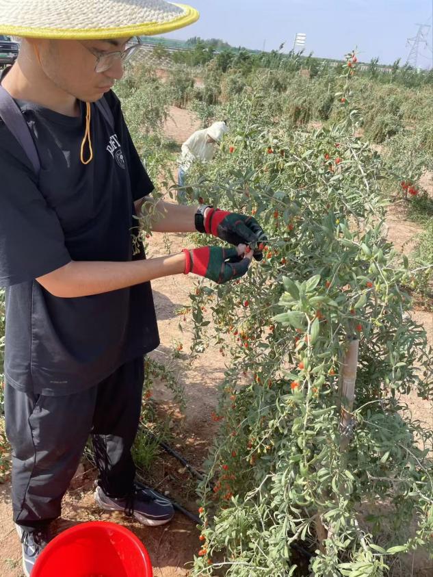 中午時(shí)分,支教隊(duì)員們前往當(dāng)?shù)罔坭椒N植基地,參與采摘枸杞的農(nóng)事勞動(dòng)。在農(nóng)戶的指導(dǎo)下,隊(duì)員們學(xué)習(xí)如辨別成熟的枸杞果實(shí)等采摘知識(shí),并親手體驗(yàn)采摘過程。
