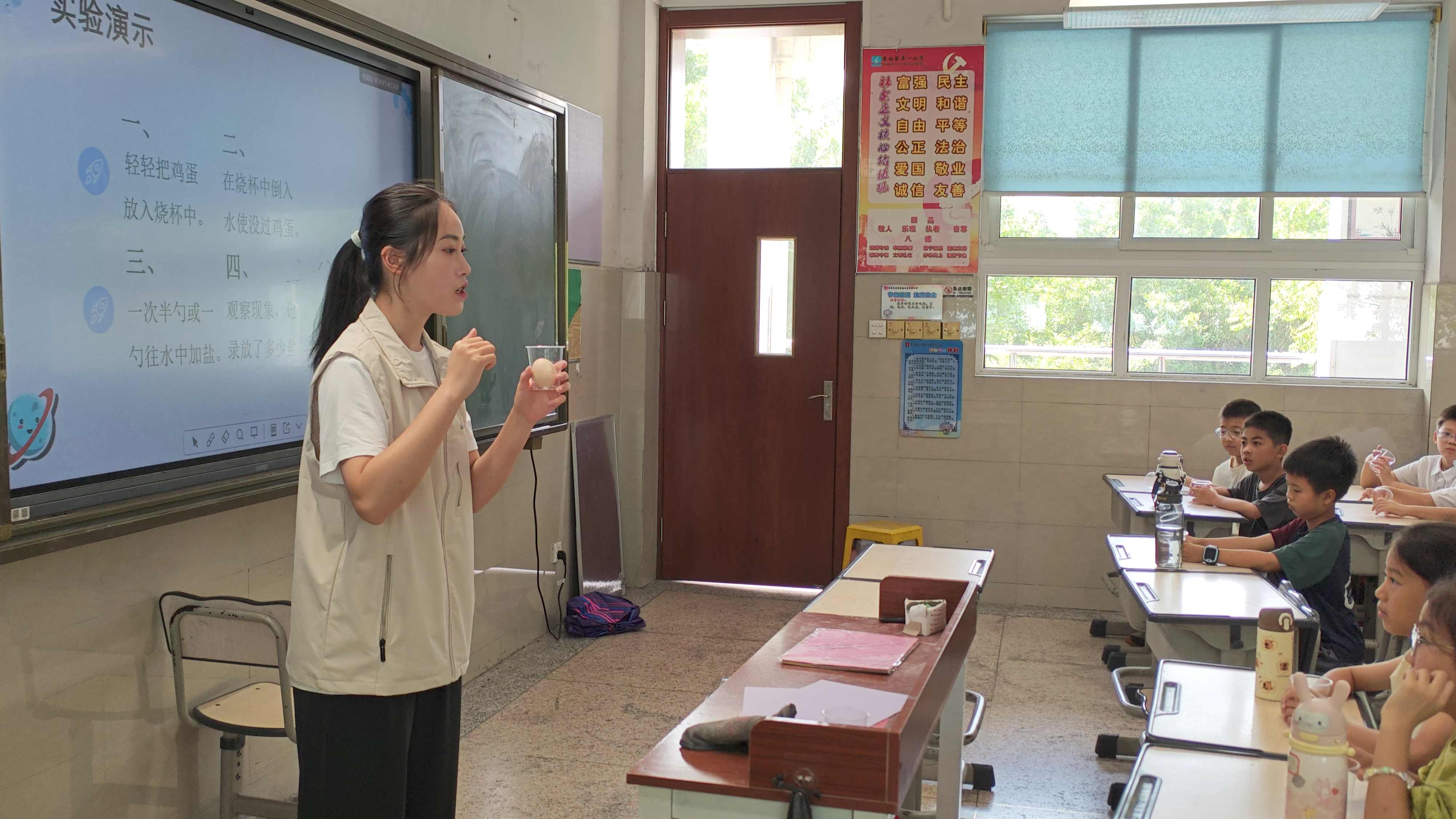 在親手實驗環節,每個小組都領到了實驗器材。孩子們小心翼翼地操作著,親自動手加鹽、攪拌、觀察記錄。當第一組的雞蛋成功浮起時,整個教室爆發出歡呼聲。很快,此起彼伏的"老師快看!我們的也浮起來了!"在教室里回蕩。楊老師穿梭在各組之間,時而指導操作,時而鼓勵表揚,教室里充滿了探索與發現的喜悅。