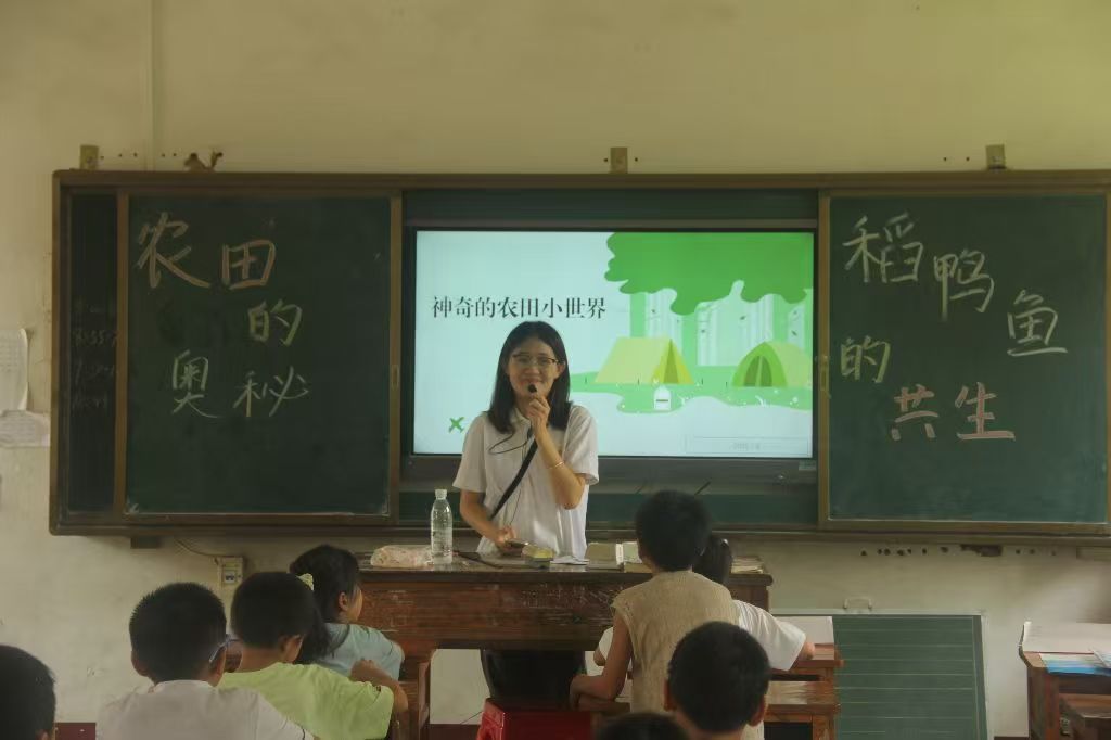 課堂通過科學實驗、互動模型演示及“青綠小劇場”角色扮演等多元形式,帶領鄉村學子親身探索“稻-鴨-魚共生系統”等傳統農田生態模式的精妙。學員們化身“生態小偵探”,在觀察水稻、辨識益蟲(七星瓢蟲、青蛙)、了解“小英雄”(鴨、魚)與“搗蛋鬼”(蝗蟲、田鼠)的互動中,直觀感受古人“桑基魚塘”式循環農業的智慧與和諧共生理念。