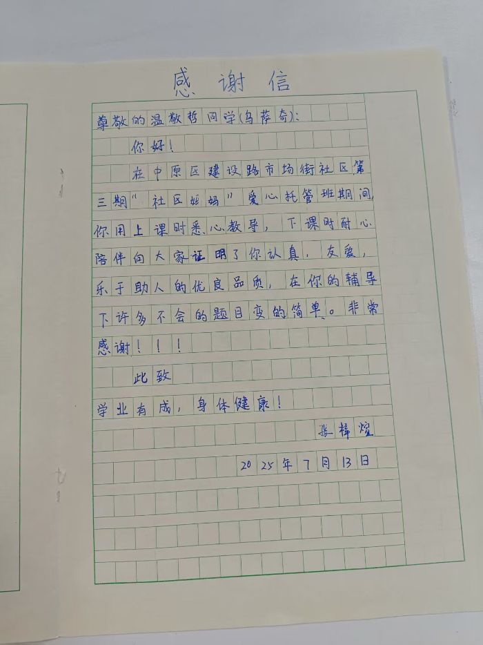 一周的托管時光轉瞬即逝,告別之日,依依難舍。然而,當他們將稚拙字跡寫就的信箋塞進我掌心,那些笨拙卻無比真誠的感謝話語躍然紙上時,心頭的暖流瞬間洶涌——原來,當你不求回報地播撒愛的種子,最終收獲的溫暖與馨香,竟會如此豐盈醇厚。那份被孩子們全心全意信賴與需要的感覺,宛若一盞澄澈的燈火,照亮并溫暖了我整個夏天,成為生命行囊里最為珍貴的饋贈。